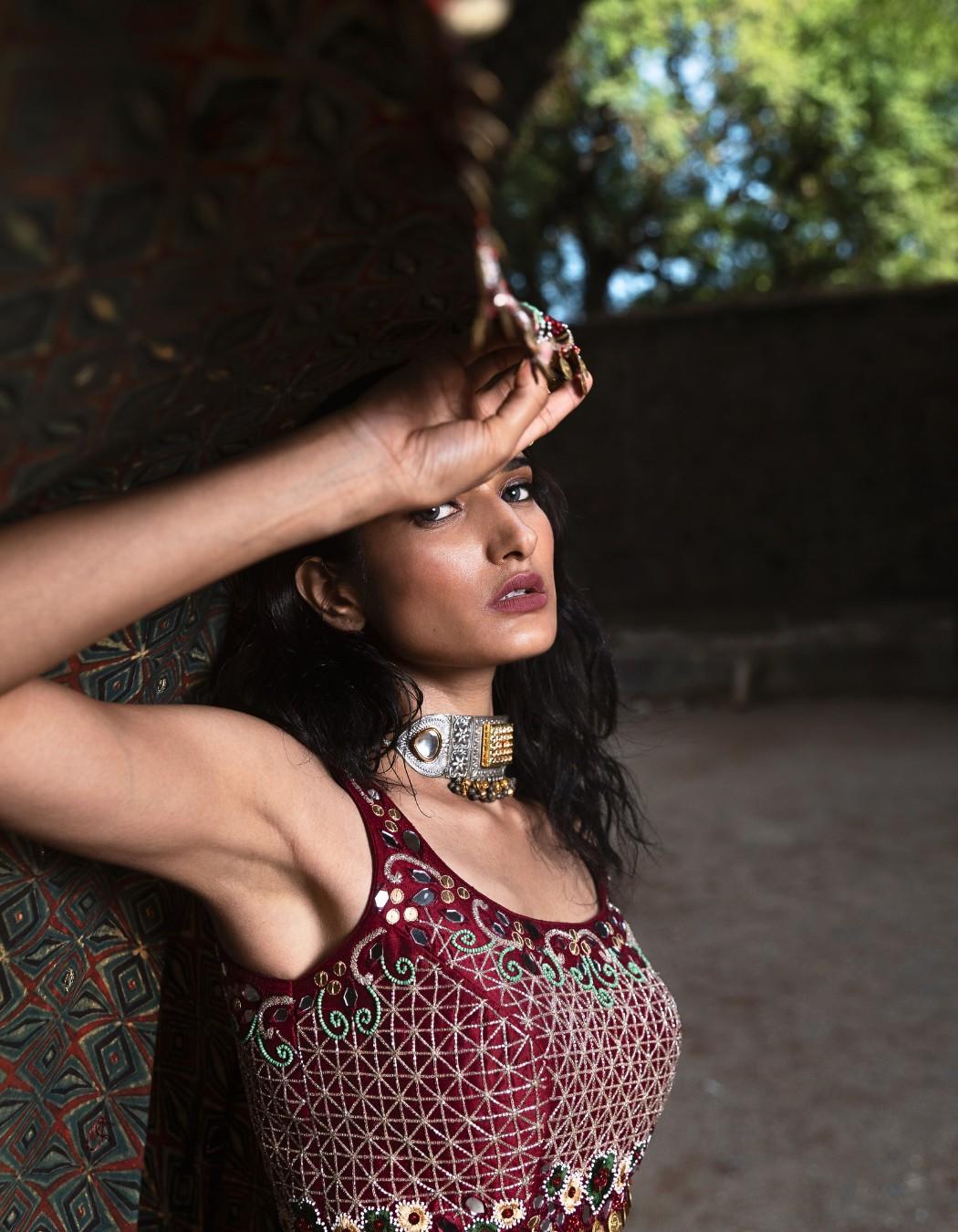 Crimson red lehenga and blouse intricately embroidered with mirror and coin work, also featuring an ajrakh printed dupatta with mirror and coin work.