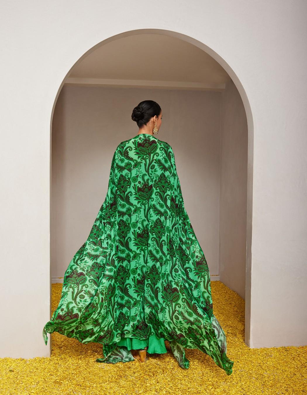 Morni Green paisley printed cape, with a draped gathered skirt and hand embroidered blouse with floral and mirror detailing.