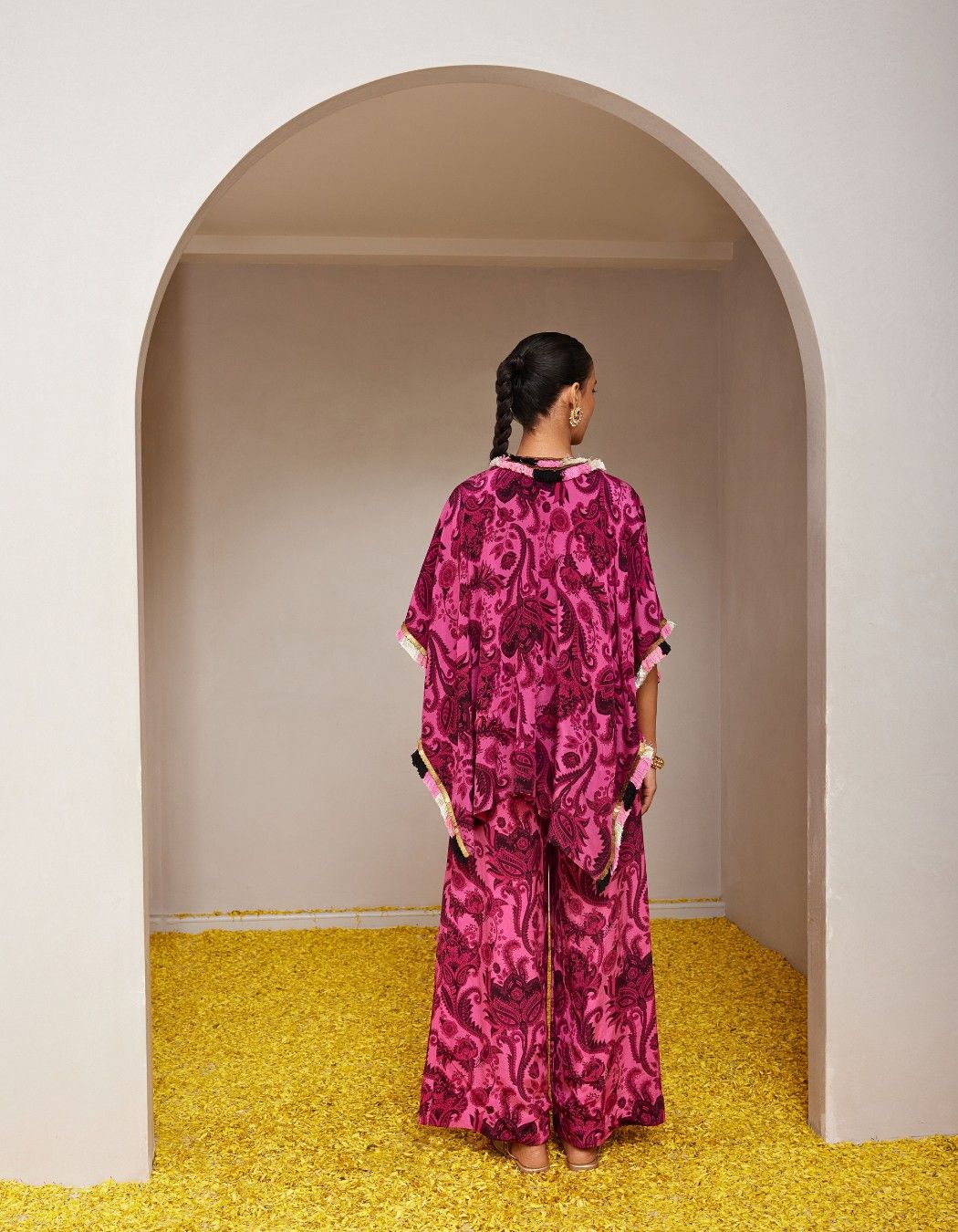 Radha Rani paisley printed cape set paired with a pleated blouse and slit pants, hand embroidered with coin and thread work.