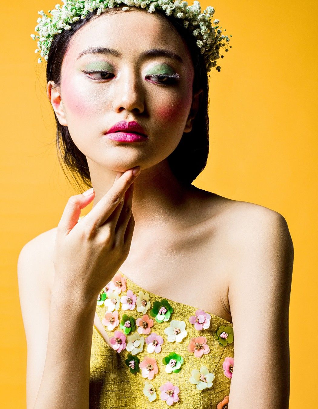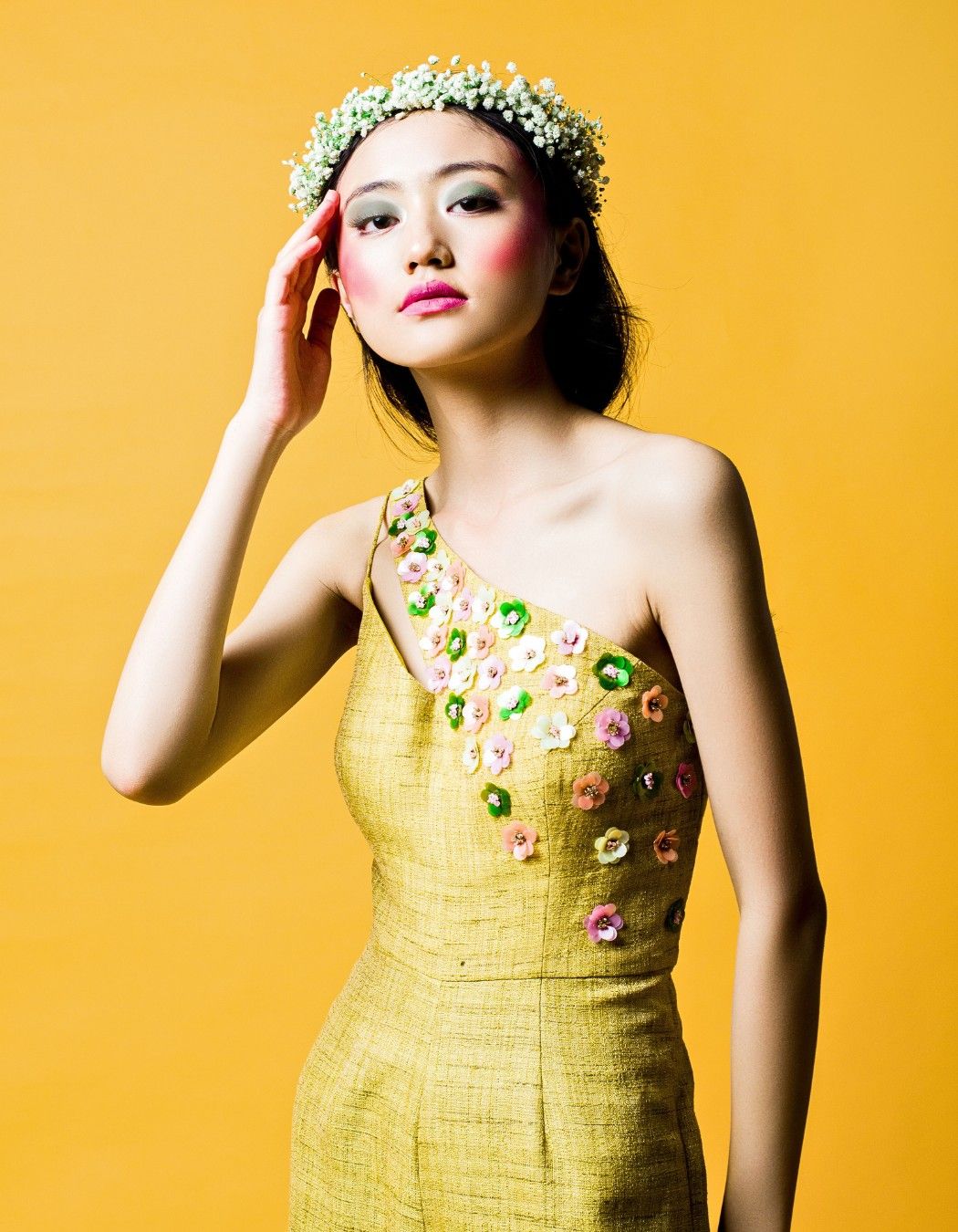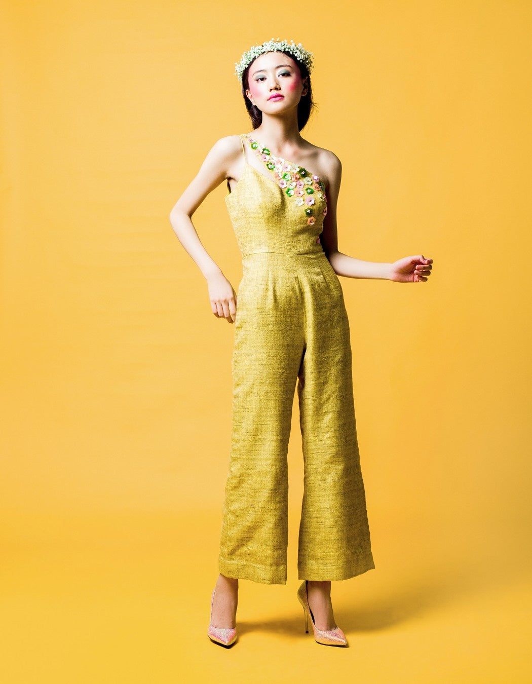 Ridhi Dogra in our lime green one shoulder jumpsuit with 3D floral motifs.