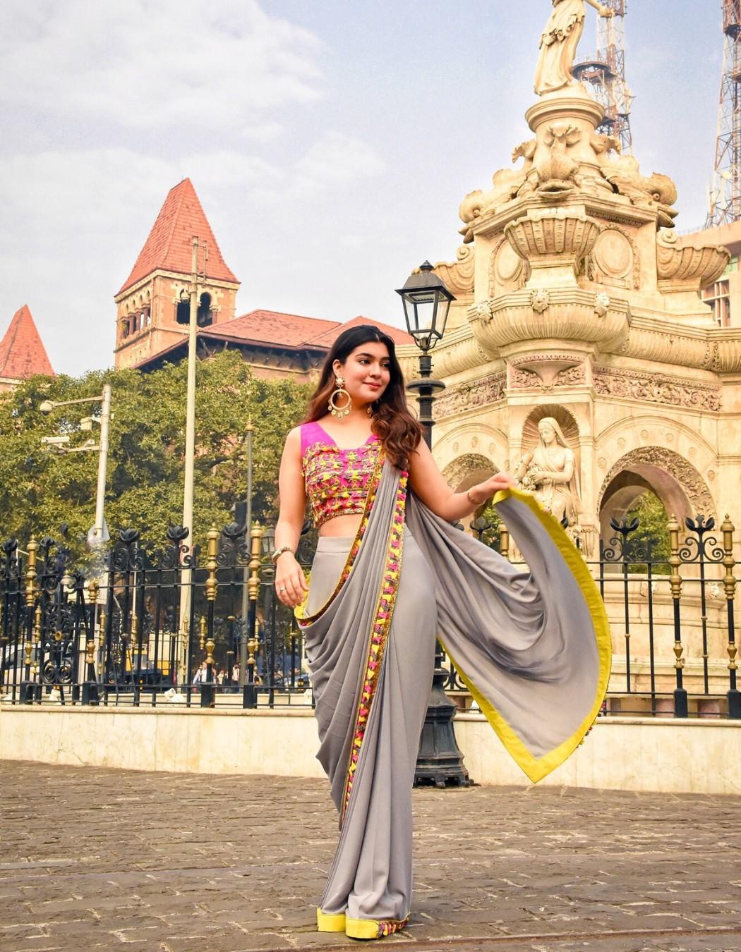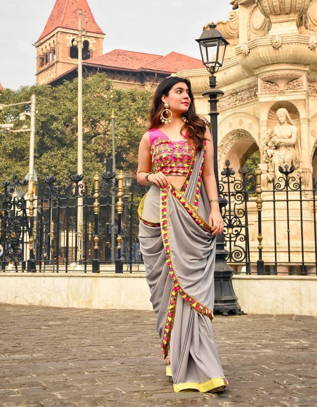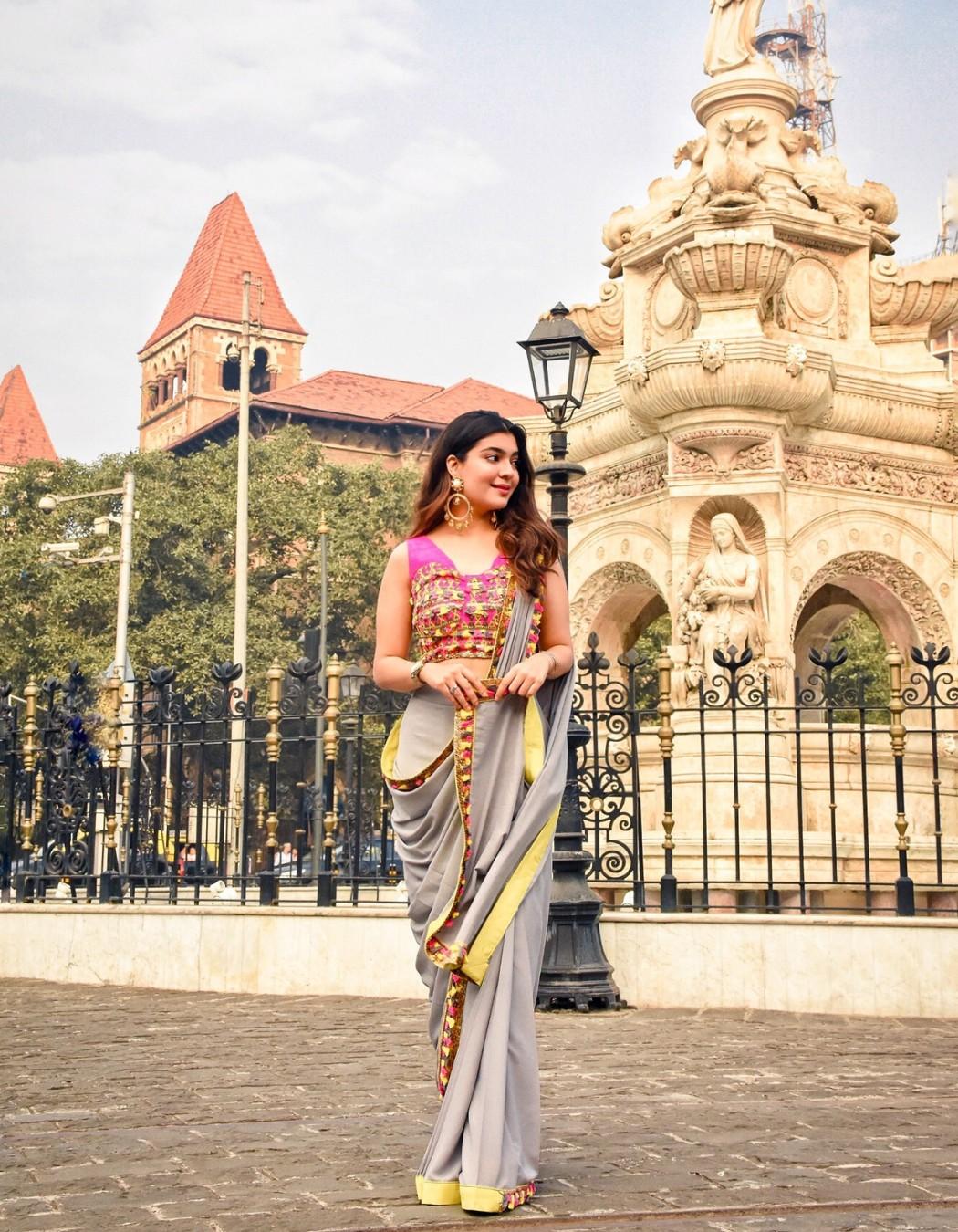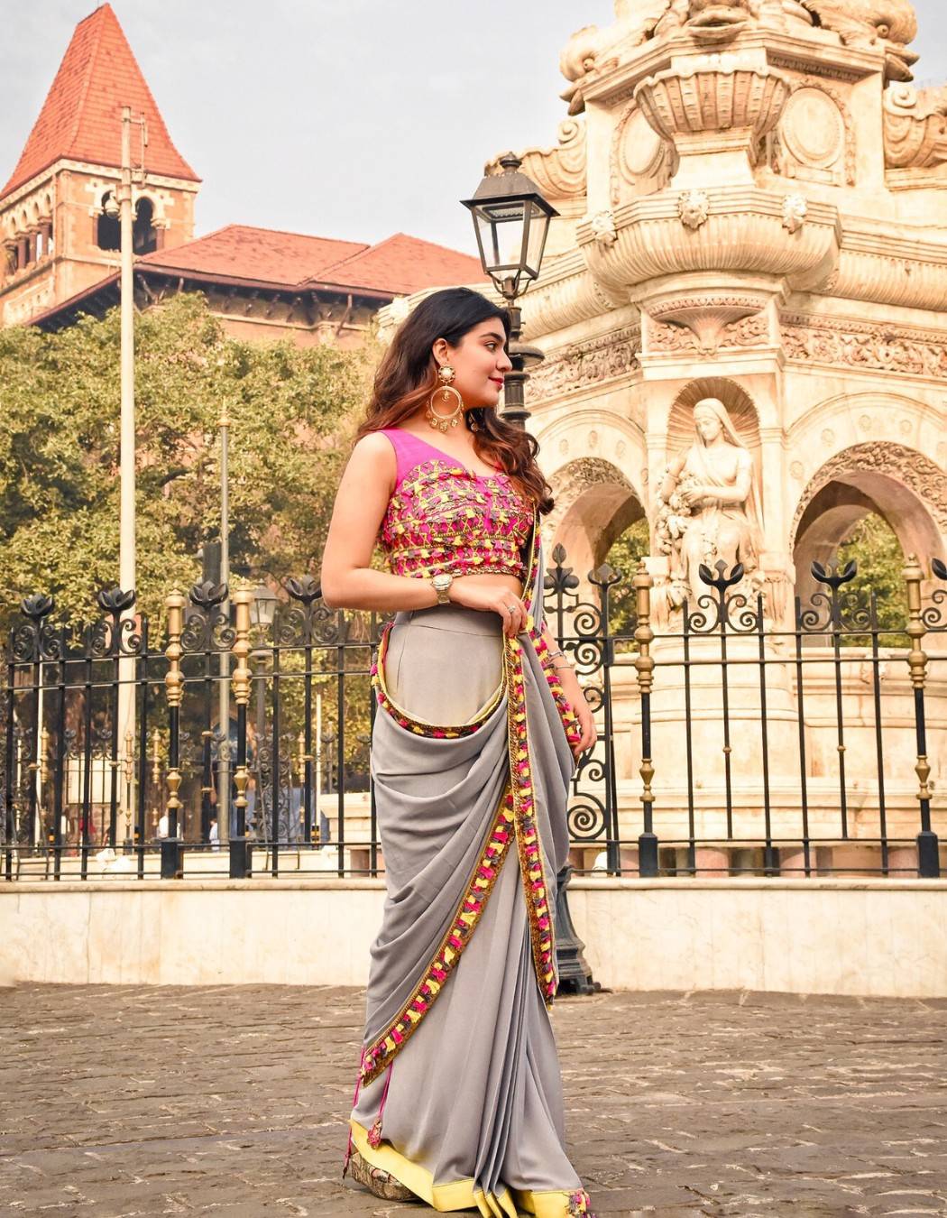 The Cister Co in our grey pre-draped saree paired with a pink colorful thread and coin embroidered blouse.