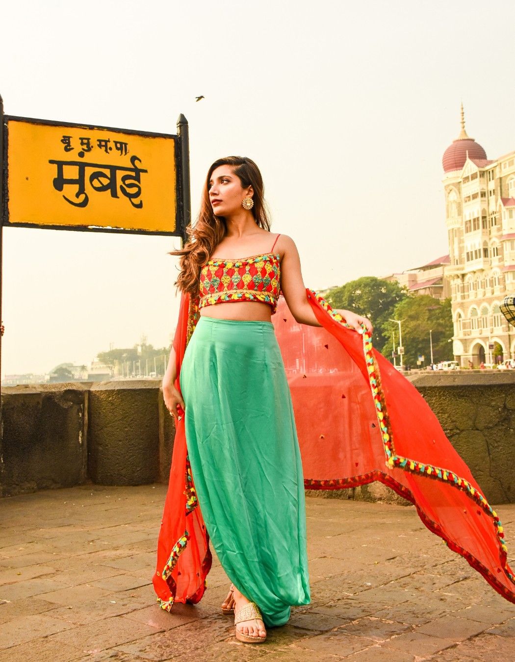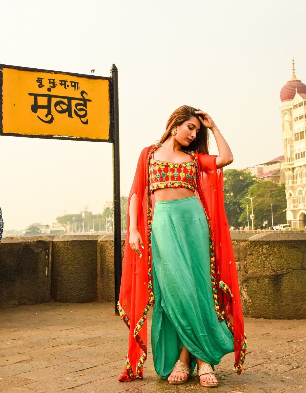 The Cister Co in our red cape set paired with a sea green draped cowl skirt and blouse, hand embroidered in colorful thread and coin work.