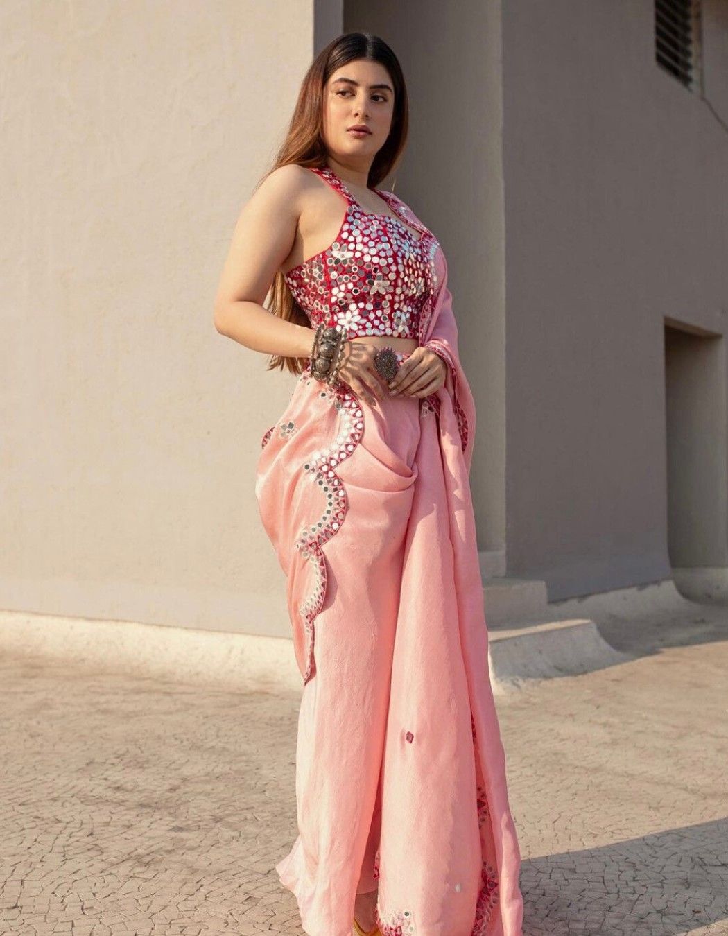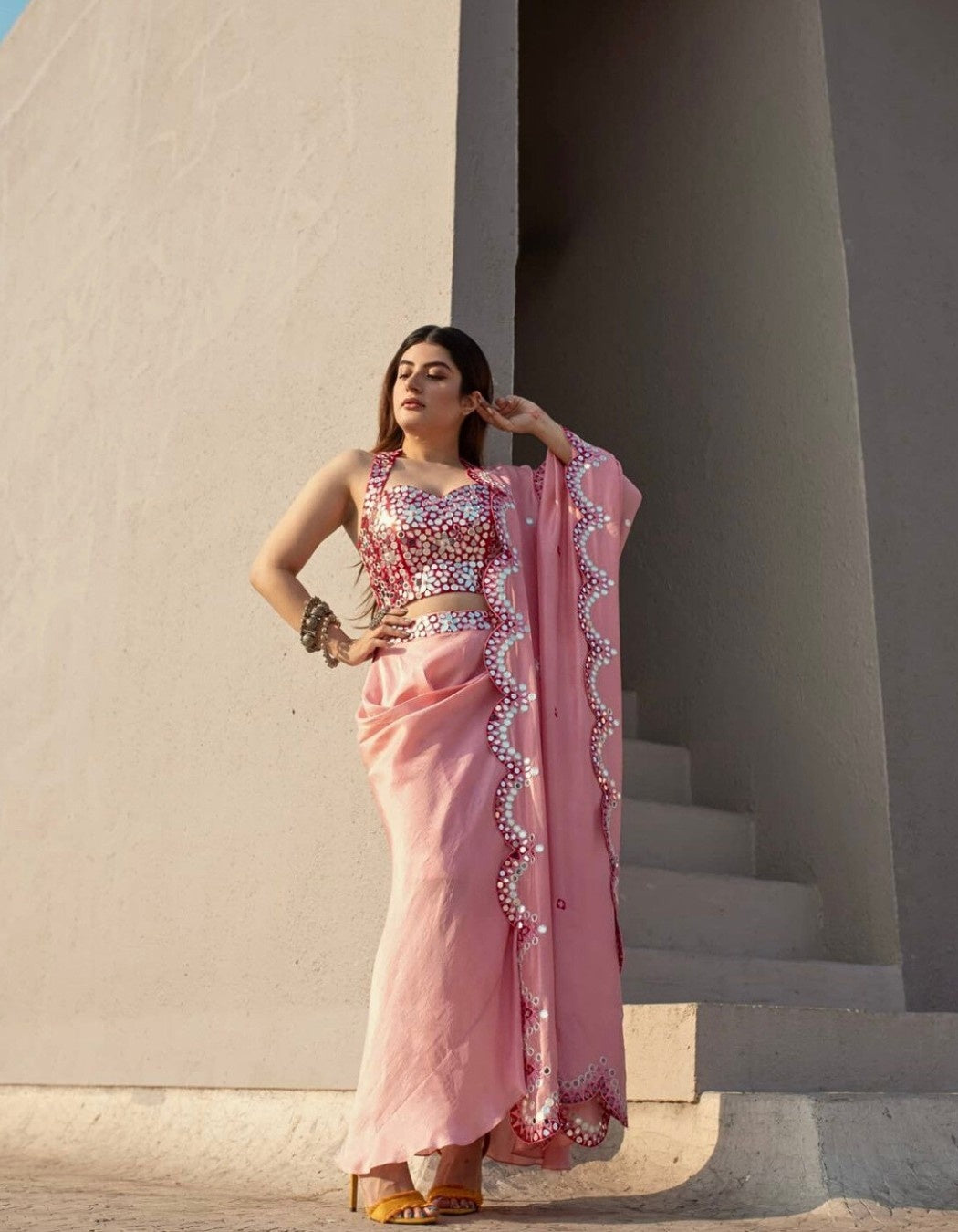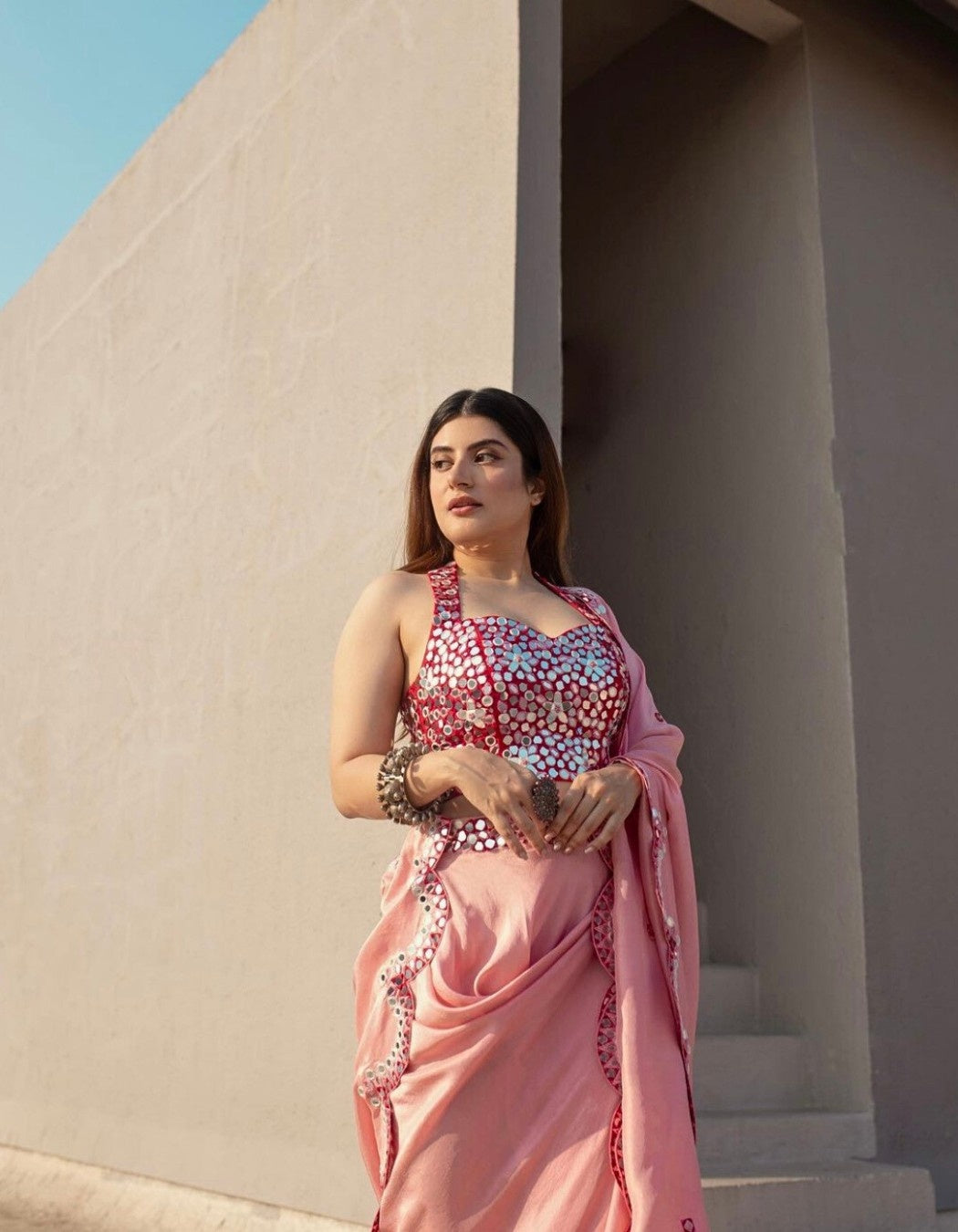 Trishala LoveBug in a light pink drape skirt set, paired with a red mirror embroidered blouse and dupatta.