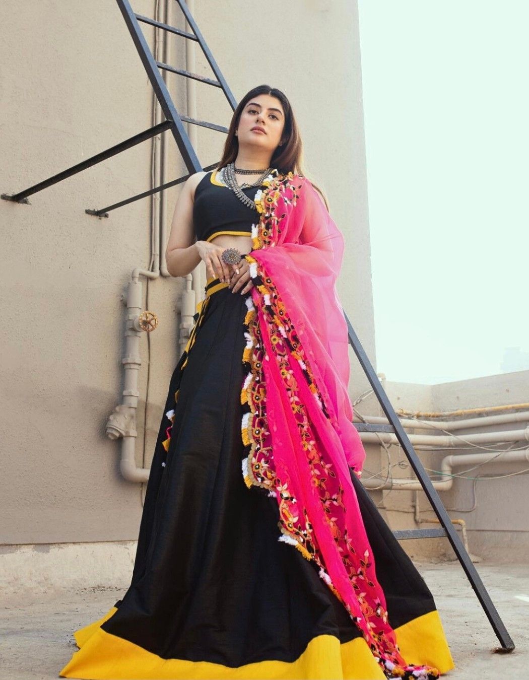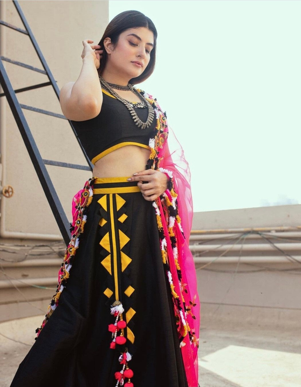 Trishala LoveBug in a black lehenga set, featuring a bright coral pink dupatta hand embroidered with colorful thread and coin work.